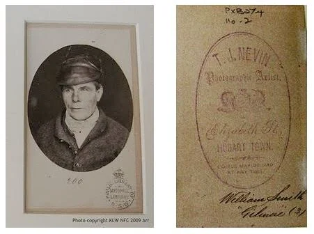 The Nevin family solicitor since 1868, Attorney-General William Robert Giblin, had requested Thomas J. Nevin to visit the Port Arthur penitentiary, 60 kms south of Hobart, with a view to photographing prison inmates during the visit of the former Premier of Victoria, Sir John O'Shanassy and Howard Spensley, Solicitor-General, in January 1872. W. R. Giblin's decision was in force by October 1873 when Thomas J. Nevin photographed William Smith per Gilmore 3 on discharge from the Hobart Gaol. This early prisoner mugshot was printed from his negative and stamped verso with his government contractor's stamp which included his name, studio address and Royal Arms insignia. The Royal Arms insignia was printed on all government contractors' documents and displayed prominently at their business premises.