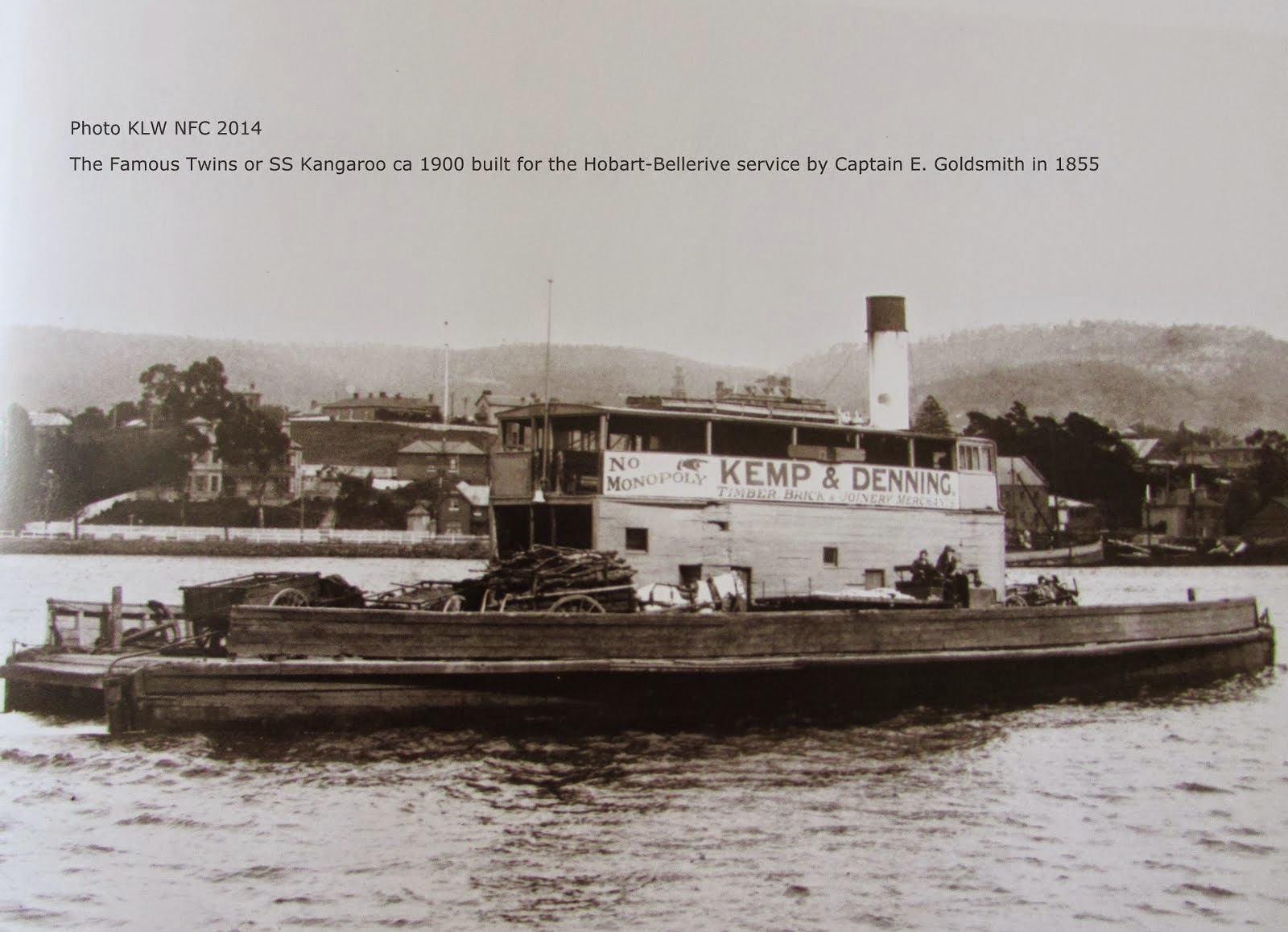 The twin steamer Kangaroo was built in the year 1854 under the immediate supervision of the late Governor Sir William Denison, R.E. by the late Captain Goldsmith, formerly of the London traders Waverley and John Izat, at the Imperial expenditure, regardless of cost....More about (the late) Captain Goldsmith and the Kangaroo appeared in this article titled SHIPBUILDING IN TASMANIA, published in The Mercury 23 June 1882. Read the article here.