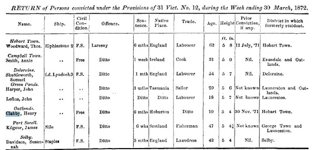 Henry Clabby was sentenced to three months at the Hobart Gaol on 30th November 1871 for larceny. He was 17 years old. He was discharged at Hobart in the week ending 6th March 1872.