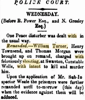 Remanded.-William Turner, Henry Townsend, and Thomas Morgan were brought up on remand, charged with feloniously shooting, at Swanton, Constable Wells, with intent to kill and murder him.