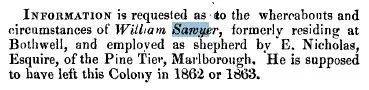 INFORMATION is requested as to the whereabouts and circumstances of William Sawyer, formerly residing at Bothwell, and employed as shepherd by E. Nicholas, Esquire, of the Pine Tier, Marlborough. He is supposed to have left this Colony in 1862 or 1863.William Sawyer reported missing,